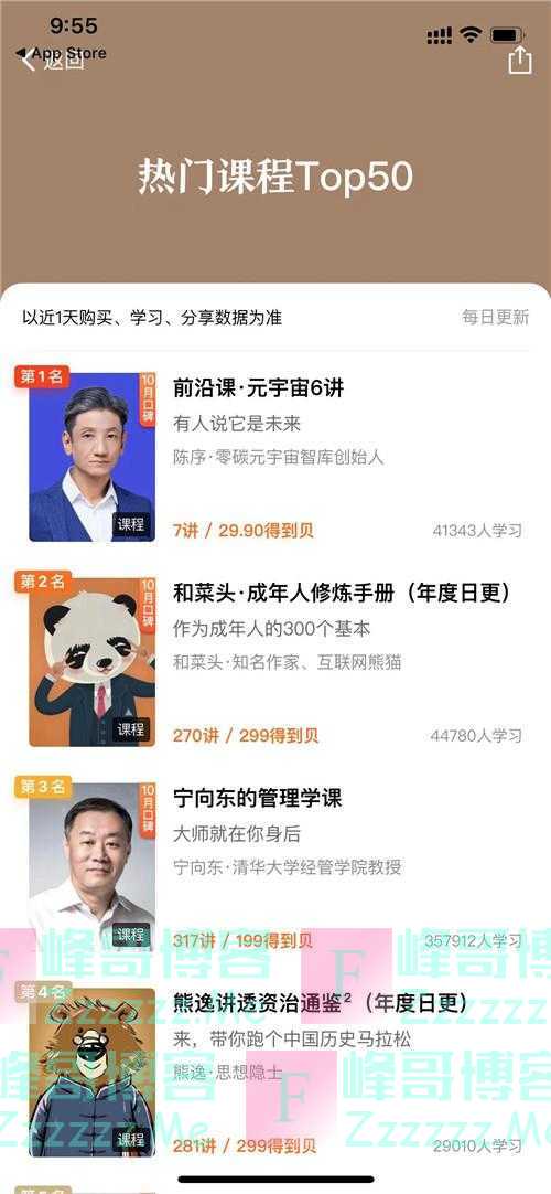11月11日,在罗振宇创立的得到APP上,《元宇宙6讲》的网课,价格为29.9元,不考虑折扣,预估总营收已超过100万元。截至发稿,学习人数已达41343人,位列热门课程Top50的第一位。