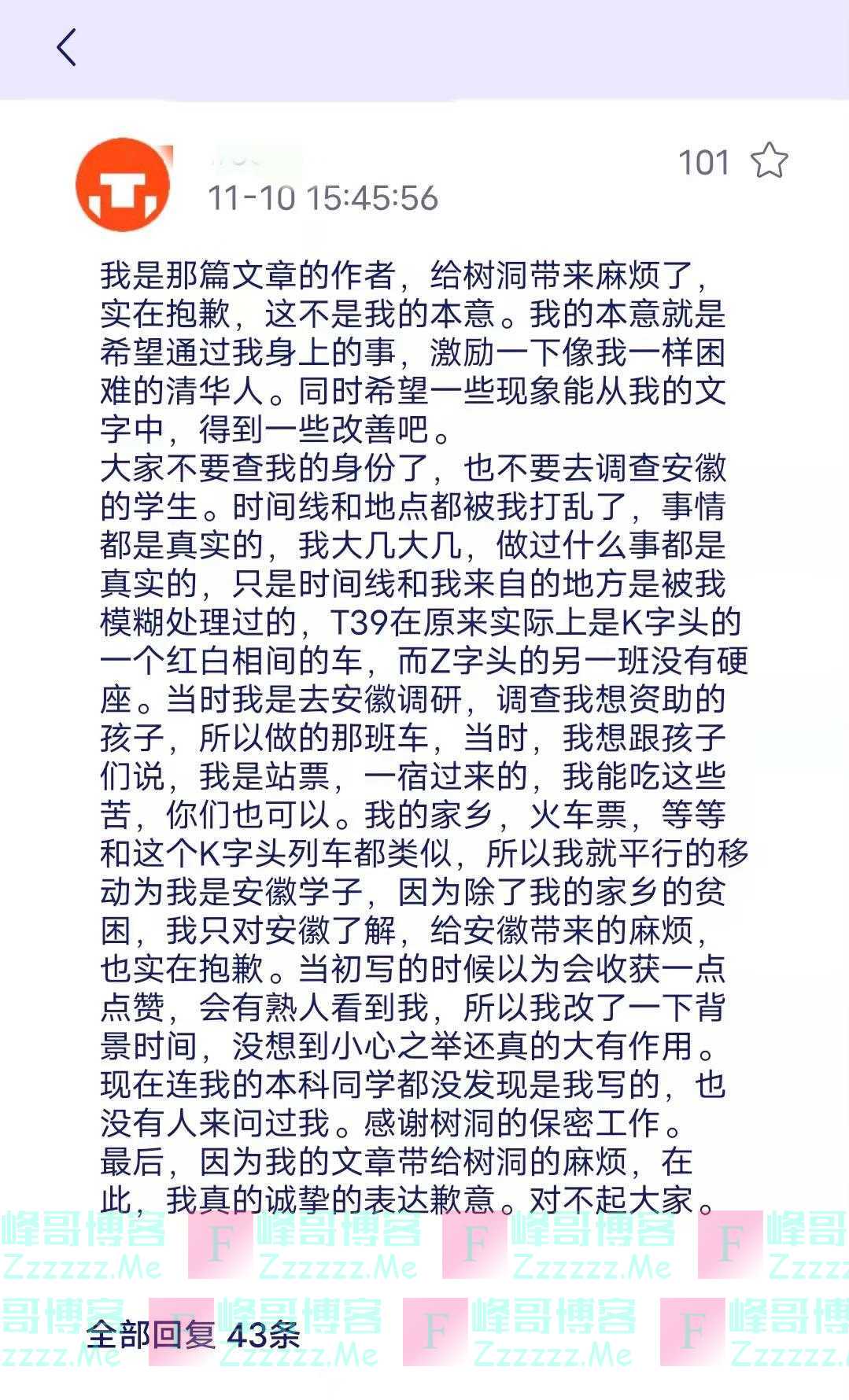 11月11日,记者注意到,知乎平台也出现了疑似得到作者本人授权的针对网友质疑的回复,其中内容与孙同学发给记者的在“清华树洞”里的回应截图基本一致。针对网友质疑最多的身份、列车车次等问题,该回复里表示:当时他是去安徽调研他想资助的学生,坐的文章中自述的这辆列车,而他的家乡、火车票等与这趟车都类似,所以他平行移动自己的身份为安徽学子。他这样做的原因,回复里解释称:“当时以为会有熟人看到,所以改了一下背景时间。”