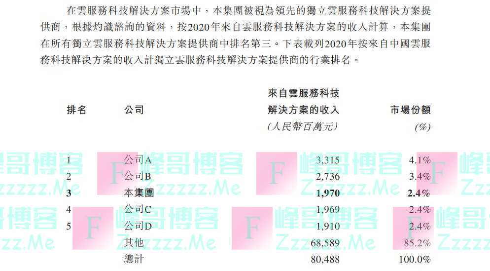 与to C型互联网平台趋于稳定的市场格局不同,在云服务科技解决方案市场中没有绝对的龙头企业。灼识咨询的资料显示:萨摩耶云的这个市场中的市场份额为2.4%、排名第三,而排名第一的公司市场份额也仅有4.1%。