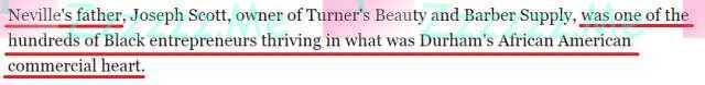 非洲裔居民安妮塔·内维尔说,每当她驾车穿过达勒姆高速公路立交桥时,就会想起她的父亲。她的父亲约瑟夫本来是社区中的一家美容理发店的老板,当时,这里的企业不断发展并衍生出其他企业,支持着达勒姆市非洲裔社区的生计和持续发展。