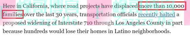 报道称,在加州,道路工程在过去30年里已经导致1万多个家庭流离失所,交通官员最近叫停了一项通过洛杉矶县710号州际公路的扩建计划,一个重要原因就是该计划将使拉丁裔社区中的数百人失去家园。