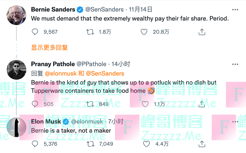 或许感觉还没“尽兴”。当地时间11月15日早间,马斯克又一次回复桑德斯推特,“伯尼是个索取者,而非创造者。”