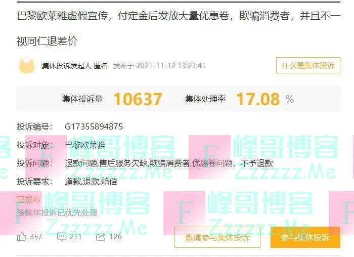 在黑猫投诉平台上,关于“巴黎欧莱雅虚假宣传,付定金后发发放大量优惠券,欺骗消费者并且不一视同仁退差价”相关问题的投诉暴涨,截至17日下午,集体投诉量达10637人。