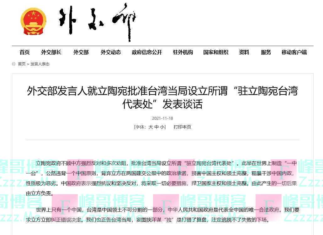 不顾中方强烈反对,立陶宛于11月18日公然宣布成立并挂牌所谓“驻立陶宛台湾代表处”。在连夜发出警告后,19日,中国外交部再次回应,对立方举动表示强烈抗议和坚决反对,将采取一切必要措施,捍卫国家主权和领土完整,由此产生的一切后果由立方负责!