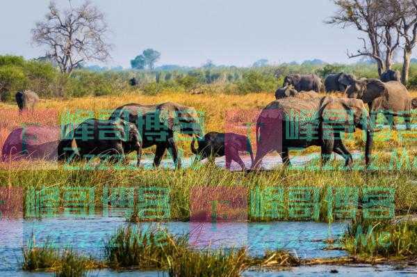 在纳米比亚野生动物丰富的卡普里维地带,大象在穆杜姆国家公园漫游。