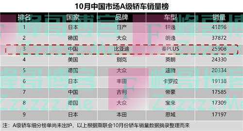 因此,比亚迪秦PLUS在10月份的全系销量达到了25908辆,杀入中国A级轿车销量榜前三名,打破了合资品牌多年来的垄断,改写了市场格局。