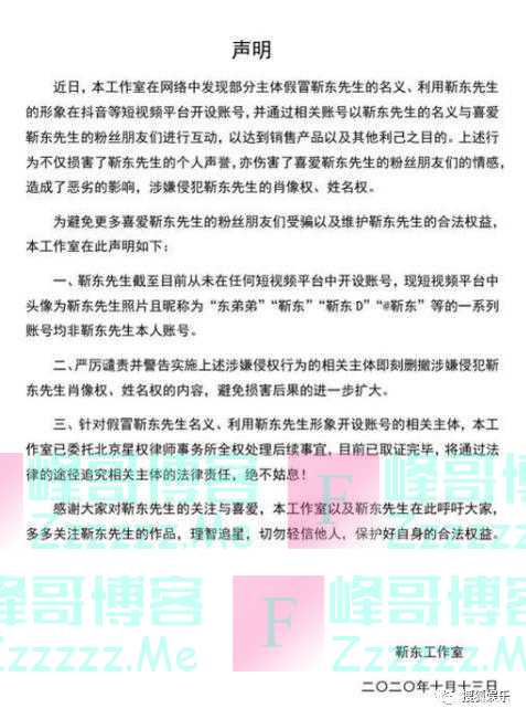 “假靳东”骗局曝光后,靳东工作室第一时间发布声明,称靳东在抖音等短视频平台未开设账号,涉事账号是假冒,已涉嫌侵犯靳东肖像权、姓名权,工作室将通过法律途径追责。