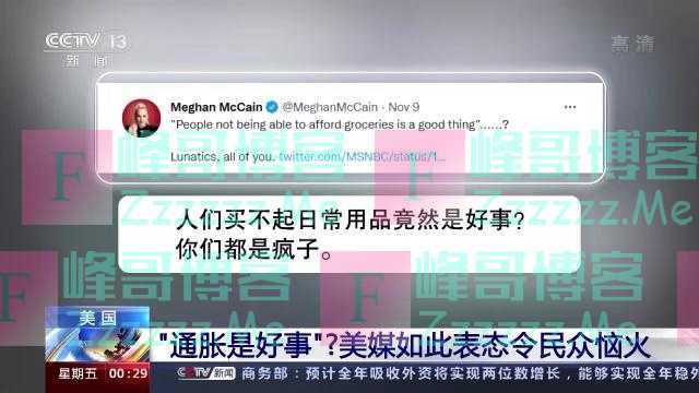 与此同时,美国微软-全国广播公司网站上刊登了一篇文章,认为通货膨胀是好事,对于为什么得出这样的结论,文章给出的理由是,通货膨胀反映了经济正在快速增长。美国前资深资深参议员约翰·麦凯恩的女儿梅根麦凯恩对此怒斥:“人们买不起日常用品竟然是好事?你们都是疯子。”