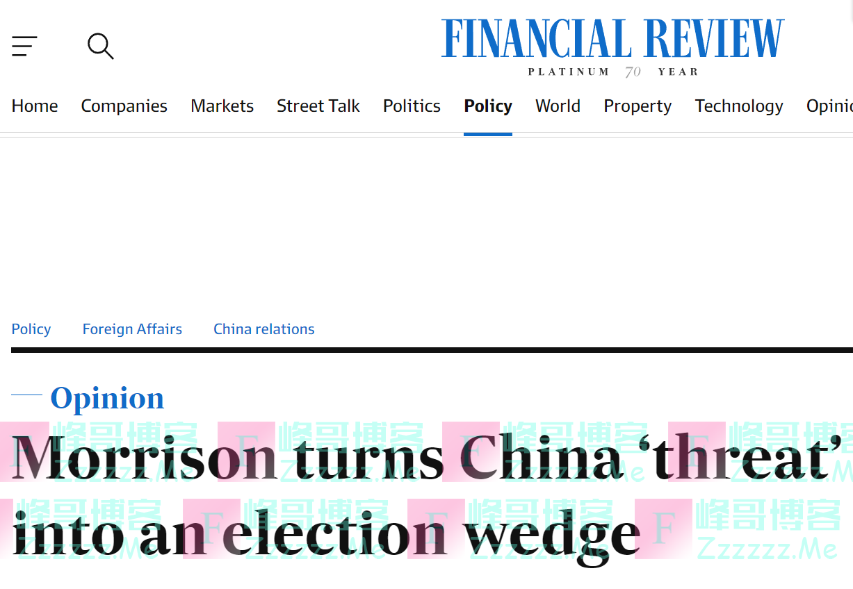 【环球网报道 记者 张晓雅】“莫里森把中国‘威胁’变成了选举的楔子。”《澳大利亚金融评论》21日的评论文章一针见血。