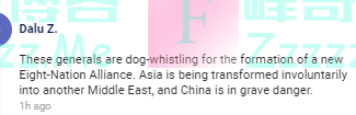 有网友称,“这些将军们正在吹嘘要组建一个新的八国联盟。亚洲正在不由自主地转变为另一个中东,中国正处于严重危险之中。”