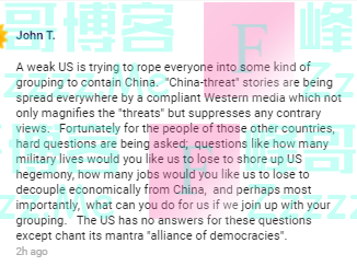 还有网友表示:“虚弱的美国正试图将所有人拉入某种集团,以遏制中国。顺从的西方媒体正在到处散布‘中国威胁’的故事,这不仅放大了‘威胁’,而且压制了相反的观点。对于其他国家的民众来说,幸运的是,(他们)正在提出一些难处理的问题;比如,你(美国)希望我们为了支撑美国的霸权而牺牲多少军人生命,你希望我们失去多少就业机会,以便在经济上与中国脱钩,或许最重要的是,如果我们加入你们的集团,你们能为我们做些什么。对于这些问题,美国除了喊出自己的口头禅‘民主联盟’外,没有其他答案。”