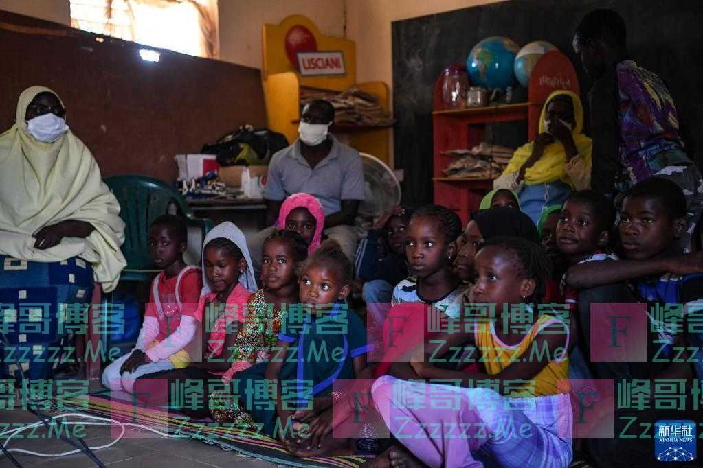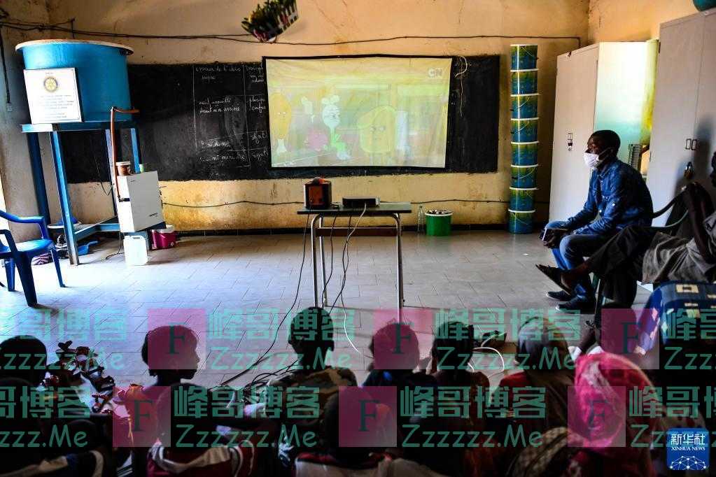 11月22日,在塞内加尔达喀尔近郊的辛迪亚小学,同学们课间坐在教室的地毯上观看投影播放的动画片。