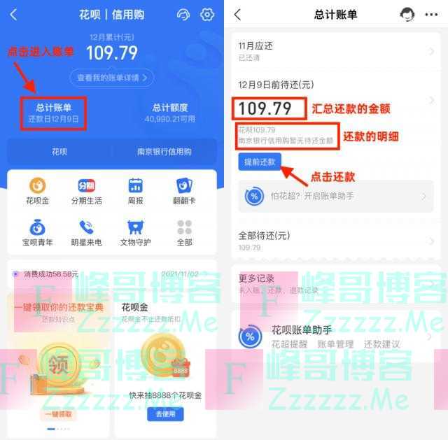 在还款时,可以在花呗|信用购首页的【总计账单】直接汇总还款,也可以分别在【花呗】或【信用购】单独还款。