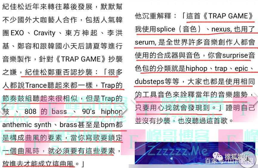 纪佳松解释说,从没遇到过这种质疑,很多人都说Trance听起来一样,Trap的节奏鼓组听起来很相似,但是Trap的鼓、808的bass等都是构成曲风的要素,就必须要有这些要素,放进去才能成立曲风,而他使用了很多创作人都会用的合成器与音色。