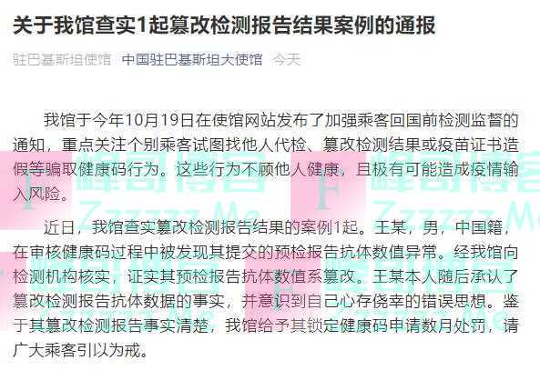 为回国篡改新冠检测结果?中使馆发布通告!》发布于2021-11-28