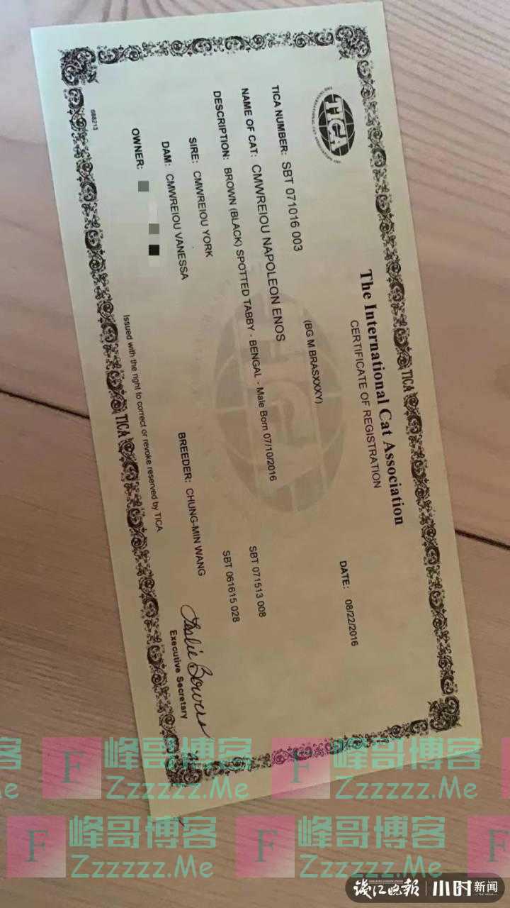 “我特别喜欢这种猫,品相好的比较难得,当时是从台湾买来的。从2016年养到了现在,这种猫身上有埃及猫和印度尼西亚野生豹猫的血统,‘无涯’的爸爸在台湾,品相更好,价值超过10万。‘无涯’曾经参加过上海的国际比赛,它的头版、四肢、体型各方面都是很好的,有TICA双证的。”