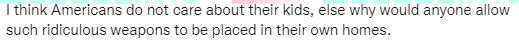 “我认为美国人不关心自己的孩子,否则怎么会有人允许这种离谱的武器出现在自己房子里?”
