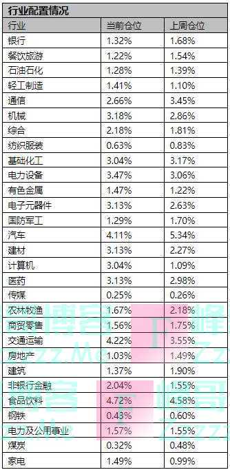 整体来看,截至11月26日,基金配置比例位居前三的行业是食品饮料、交通运输和汽车,配置仓位分别为4.72%、4.22%和4.11%;基金配置比例居后的三个行业是传媒、煤炭和钢铁,配置仓位分别为0.25%、0.32%和0.43%。