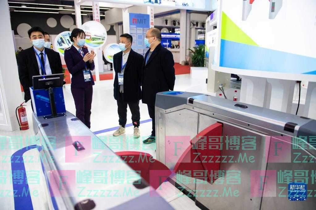 12月8日,在2021中国国际轨道交通和装备制造产业博览会上,工作人员(左二)向观众介绍地铁边门闸机。