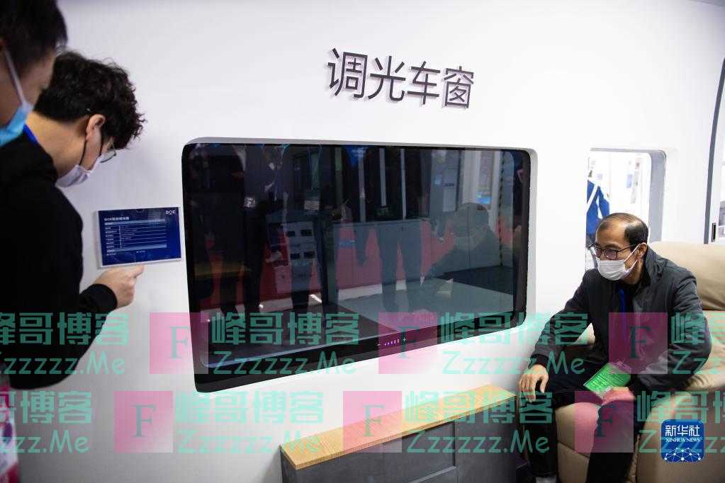 12月8日,在2021中国国际轨道交通和装备制造产业博览会上,观众(右)在观看京东方展台上的调光车窗。