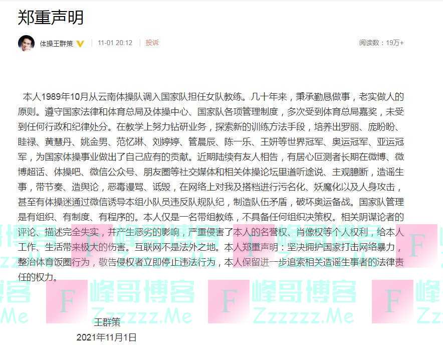 11月1日,王群策突然发布了郑重声明,称自己几十年来秉承勤恳做事、老实做人的原则,遵守国家法律和各项管理制度,多次受到体育总局的嘉奖,从未受处分。但最近,有人在社交媒体和体操论坛里造谣、诋毁他,在网络上对他进行人身攻击,污名化、妖魔化;甚至有体操迷通过微信诱导本组小队员违反队规队纪,制造队伍矛盾,破坏奥运备战。文末,王群策郑重声明:“坚决拥护国家打击网络暴力,整治体育饭圈行为,敬告侵权者立即停止违法行为。”
