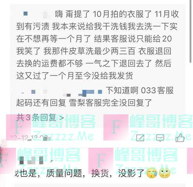 记者注意到,不少消费者在店铺商品下架前已经付款购买,目前正为退换货问题和商品返现问题担心。有网友表示,自己10月在雪梨店铺下单的皮草,等了一个多月好不容易收到了,发现有污渍后找客服换货,到现在也没有发货,现在店铺封了不知道该怎么办。还有网友在雪梨店铺下单了两件皮草,确认收货后可以返现,现在雪梨店铺客服不回消息,目前正担心不能返现。