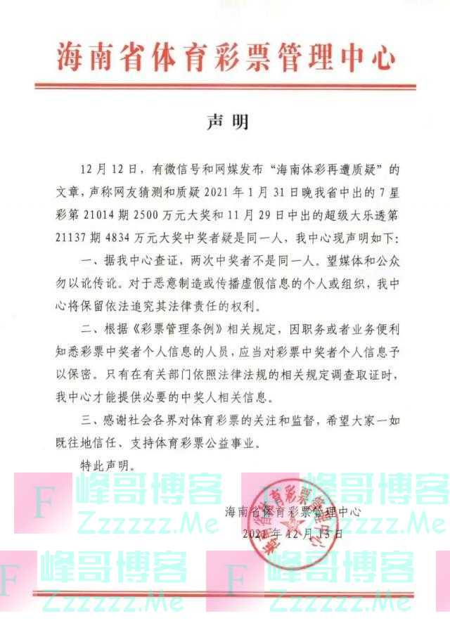 针对质疑,日前海南体彩中心发声明称: