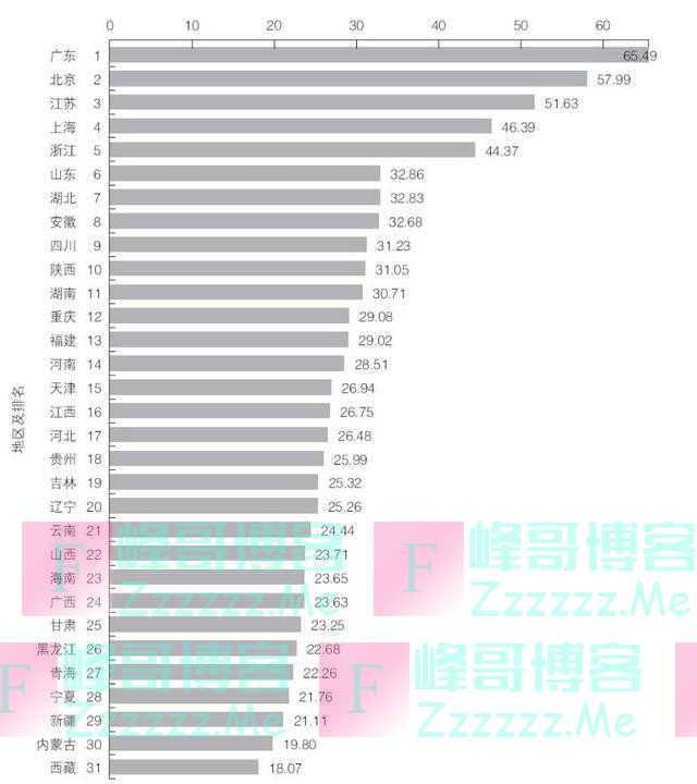 2021年,广东区域创新能力排名第1位。广东、江苏、浙江等东部沿海省份及北京、上海等特大型城市,依然是创新能力领先地区;山东、湖北、安徽齐头并进、相差无几;(2019年的数据,疫情对湖北的影响还未体现),山东的领先优势在缩小;四川、陕西、湖南,重庆、福建、河南,紧随其后;贵州、云南等西部地区追赶势头迅猛,创新步伐不断加快。