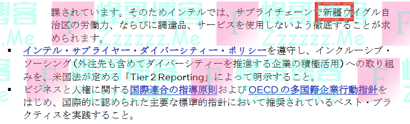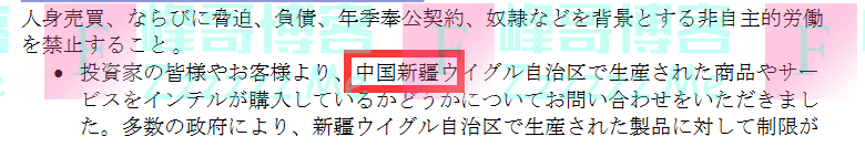我们的投资者和客户已询问英特尔是否从中国新疆地区采购产品或服务。多个国家与地区的政府已对来自新疆地区的产品实行限制。因此,英特尔需要确保我们的供应链不使用任何来自新疆地区的劳工、采购产品或服务。
