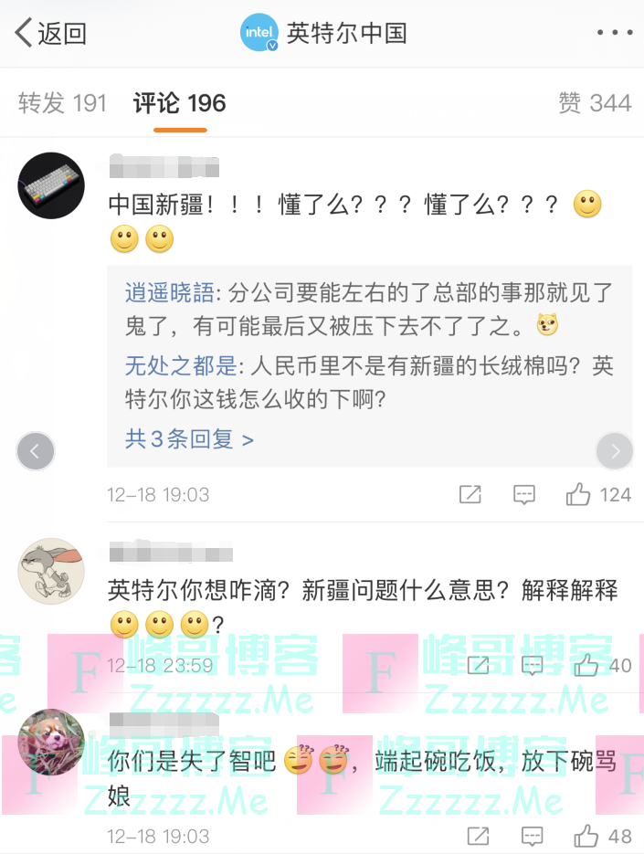 在英特尔禁用新疆产品的消息传出后,中国网友纷纷涌入英特尔官方微博账号下方质问该公司: