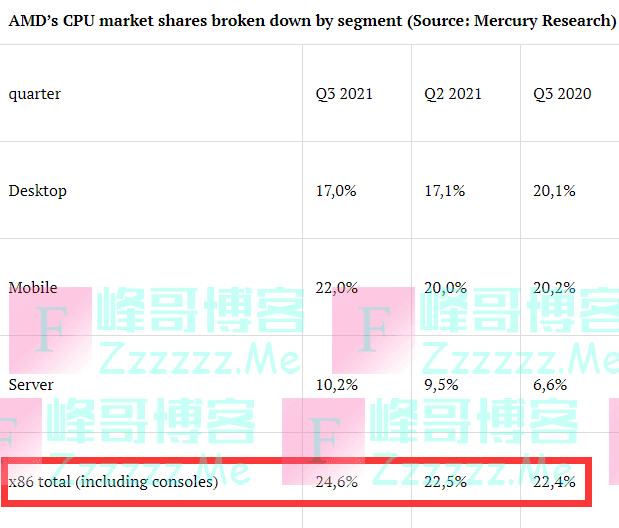 在英特尔跟随西方政客炒作新疆议题之际,其市场份额也正被竞争对手AMD侵蚀。市场调研机构Mercury Research的数据显示,2021年第三季度,AMD在X86 CPU市场上的整体份额环比增加了2.1个百分点,达到24.6%,这是AMD历史上第二高的纪录,15年前该公司曾创下最高纪录25.3%。
