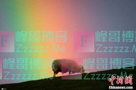英国威尔士特里费格卢伊斯,一只绵羊在彩虹下吃草,画面唯美。图片来源:ICphoto