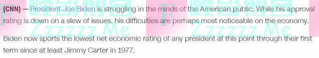 美媒公布的最新民调结果显示,拜登目前的净经济评级已创下了1977年以来美国历届总统在第一届任期内的最低纪录。