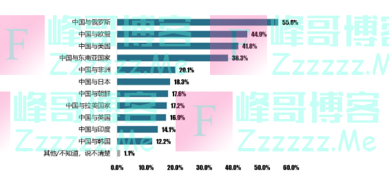 在回答“对中国影响最大的双边关系”这一多选问题时,过半(55.6%)受访者选择“中国与俄罗斯的关系”,中选率居第一;“中国与欧盟的关系”(44.9%)和“中国与美国的关系”(41.8%)中选率均超过四成,分列第二和第三位。中国与东南亚国家关系和中国与非洲关系列第四和第五位。