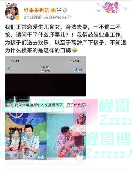 再为人母,红果果想在网上和网友分享这份喜悦。网上晒出有一张二人合影对比照,时间横贯16年。左面是舞台照,两人还是青春模样。右面是现实照,红果果怀着宝宝,耿晨晨则亲昵地吻着孕肚。一位网友留言就“内涵”了一句,“我就知道这两个人在智慧树下,没干什么好事。”对此,陈苏发文回怼网友,“合法夫妻,一不偷二不抢,请问干了什么坏事儿?!”网友自作聪明的槽点,也是暗示他俩在工作当中“成人向”了,按其他的公众人物的操作,要么就是装作看不到,要么就是嘻嘻哈哈两句“你们知道得太多”“少儿不宜”就过去了。但是,红果果却较起真来了,和自己的粉丝杠了起来。
