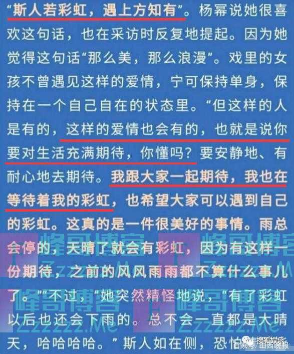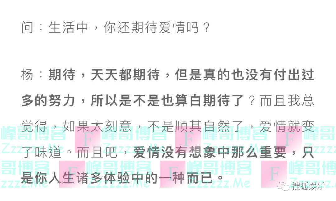 最近的采访里,杨幂依然说自己在期待爱情,但不是期待了就会有的,她选择顺其自然。