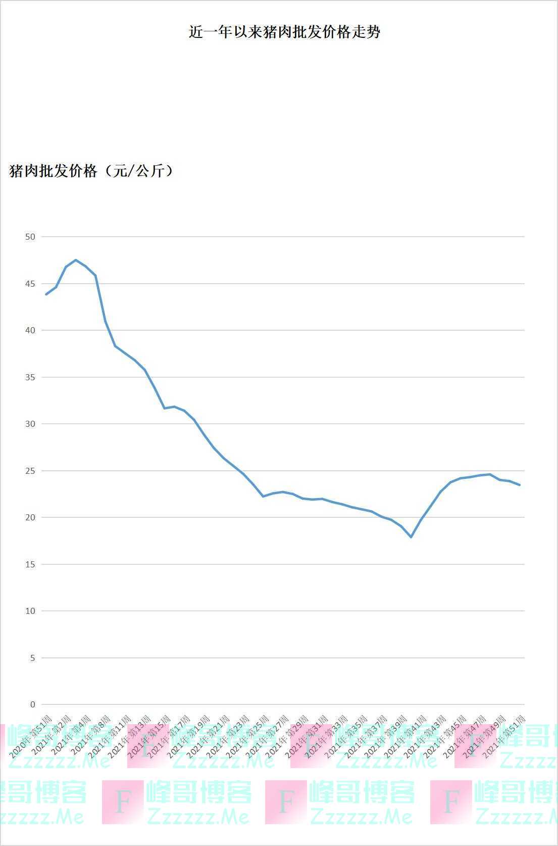 近一年以来猪肉批发价格走势 制图 彭艳秋从近一年以来的猪肉批发价格走势可见,2021年的第三周,猪肉批发价格达到一个高点,为47.51元/公斤,之后便是持续的波动性下跌,直到第40周,也就是10月中旬,到达最低点,仅有17.90元/公斤。此后由于收储的刺激带来超跌反弹,加上消费的前置以及供应的后移,造成了短期供需的错配,两阶段的作用力下,猪肉连续八周上涨,但即使是恢复到近期的最高点,也仅为24.6元/公斤,比去年同期下降39.1%。此前国泰君安产业服务研究所首席研究员周小球对澎湃新闻记者表示,“12月份中下旬以后,市场可能开始会有一些摇摆,主要是因为这段时间腌腊的需求得到了证实,并且整个供应可能也会出现一些放量。对于养殖户来讲,在真正的大量消费还没有来临之前,完全不担心卖不掉,但是越往后,可能就会担心,特别是临近12月底。因此,进入这个环节后,价格走弱的概率会比较高。”
