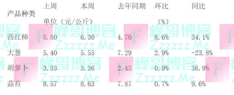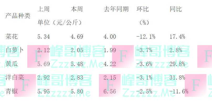 重点监测的水产品价格及变化幅度全国286家产销地批发市场19种蔬菜平均价格为4.69元/公斤,比上周下降1.0%,同比上升9.2%。监测的19种蔬菜价格中,本周西红柿、大葱、胡萝卜和蒜苔的价格环比涨幅较大,幅度为8.6%、2.9%、0.9%和0.7%;菜花、白萝卜、黄瓜、洋白菜和青椒的价格环比降幅较大,幅度分别为12.1%、3.7%、3.6%、3.1%和2.5%。