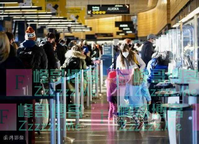 当地时间2021年12月27日,美国西雅图,旅客在机场。据报道,由于新冠变异病毒奥密克戎毒株导致美国新冠确诊病例激增,机场多架次航班被取消。图源:澎湃影像