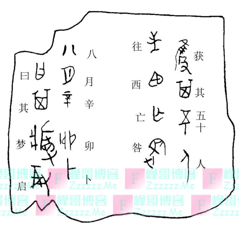 文王还曾经占卜到哪里能俘获人,释文是:“八月辛卯卜曰:其梦启;往西,亡咎,获其五十人?”大意是:八月辛卯日占卜,做梦得到启示,往西方没有灾祸,能捕获五十个人吗?