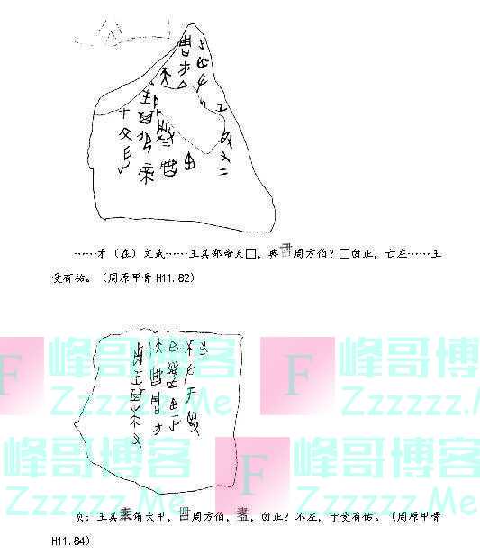 这两片甲骨的内容是发生在殷都的,但制作风格又是周原的。很可能是文王在殷都参加祭祀、册封仪式,目睹了进行占卜和刻写卜辞的过程,文王一直试图获得商王占卜通神的能力,梦想自己能沟通诸神、推进翦商事业,所以他牢牢记住了整个占卜过程。等回到周原之后,他又偷偷模仿了整个过程,包括刻写卜辞。