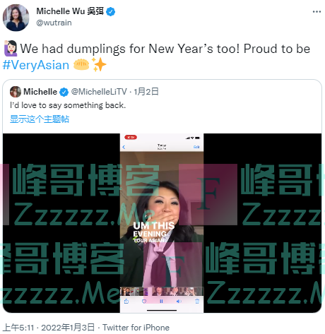 众多网友中就有波士顿华裔市长吴弭,她在推特回复称:“我们在新年也吃饺子!很自豪能变得‘#非常亚裔’。”↓