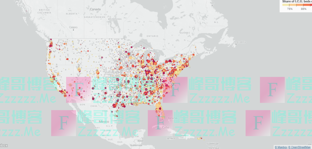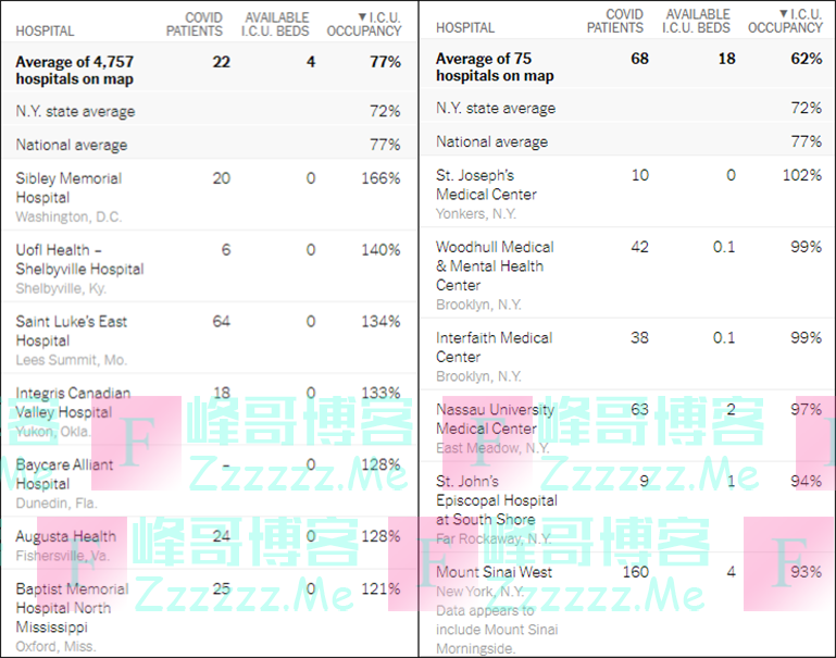 《纽约时报》制作的图表显示,ICU超负荷运转的医院在全美超过40家,位于华盛顿特区的一家医院的ICU占用率高达166%。其中,纽约医院的ICU占用率达到72%,最高达102%。