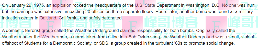 - 比尔·艾尔斯是“地下气象员”组织的创始人。该组织宣布对上世纪70年代的多次爆炸案负责,被美国联邦调查局定性为“恐怖组织”。