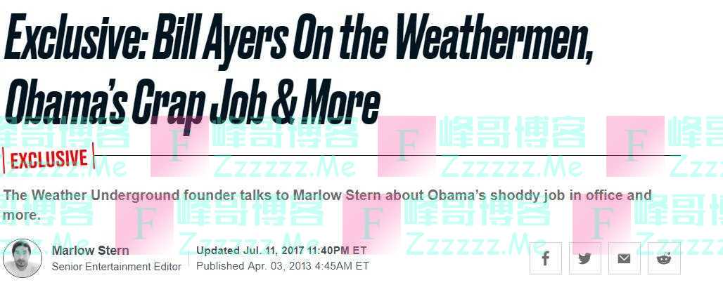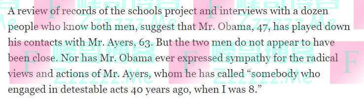 《野兽日报》报道标题:“独家:比尔·艾尔斯论地下气象员、奥巴马的垃圾工作以及其他”事实上,如果仔细阅读被佩林作为武器在竞选中攻击奥巴马的《奥巴马与60年代的爆炸者》,可以发现,这篇文章并未提出任何关于奥巴马同艾尔斯保持特殊关系的证据。恰恰相反,在作者的叙述中,“二人看起来并不亲密”。“奥巴马先生没有表达过对激进观点和艾尔斯先生行为的同情。”