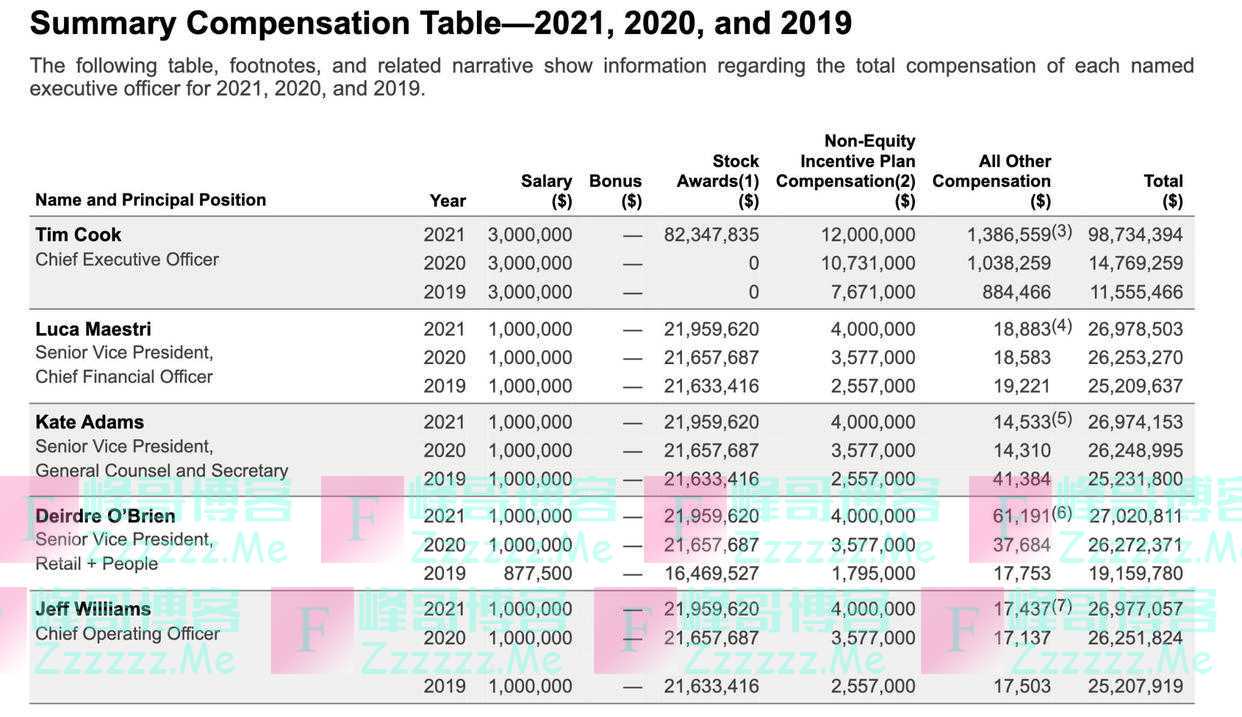 苹果其他高管,包括高级副总裁、首席财务官卢卡·梅斯特里(LucaMaestri);高级副总裁、法务总顾问兼秘书凯特·亚当斯(KateAdams);高级副总裁、零售及人事迪尔德丽·奥布莱恩(Deirdre O’Brien)和首席运营官杰夫·威廉姆斯(JeffWilliams)分别获得了超过2600万美元薪酬。