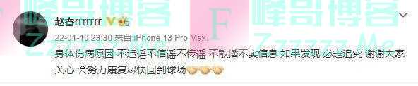 虚惊一场!赵睿“极度不适”引外界猜测,实为身体伤病需休养》发布于2022-1-12