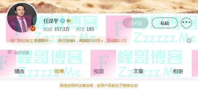 12日,拥有357.3万粉丝的任泽平微博账号被禁言了,原因是“违反相关法律法规”。
