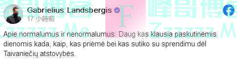 兰茨贝尔吉斯当天在社交媒体脸书上发文声称,来自台湾的人希望被称作“台湾人”,“这完全正常,也不违背任何立陶宛的国际义务或协定”;他进而宣称“这不是一个错误”。 他还强词夺理称,他不解为何去年7月立台双方宣布“台湾代表处”拟在首都维尔纽斯成立时,各界没这么多质疑。