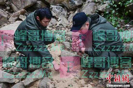 1月14日,广东省韶关市,广东南岭国家级自然保护区林业技术员周智鹏(右)与工作人员张崇万在保护区内发现野生动物啃咬过的树木,随后在该树木旁安装红外相机用于监测。该保护区森林覆盖率达98%以上,是粤港澳大湾区重要的生态安全屏障,也是广东省生物资源最丰富的自然保护区和最大的生物物种基因库。 中新社记者 陈骥旻 摄